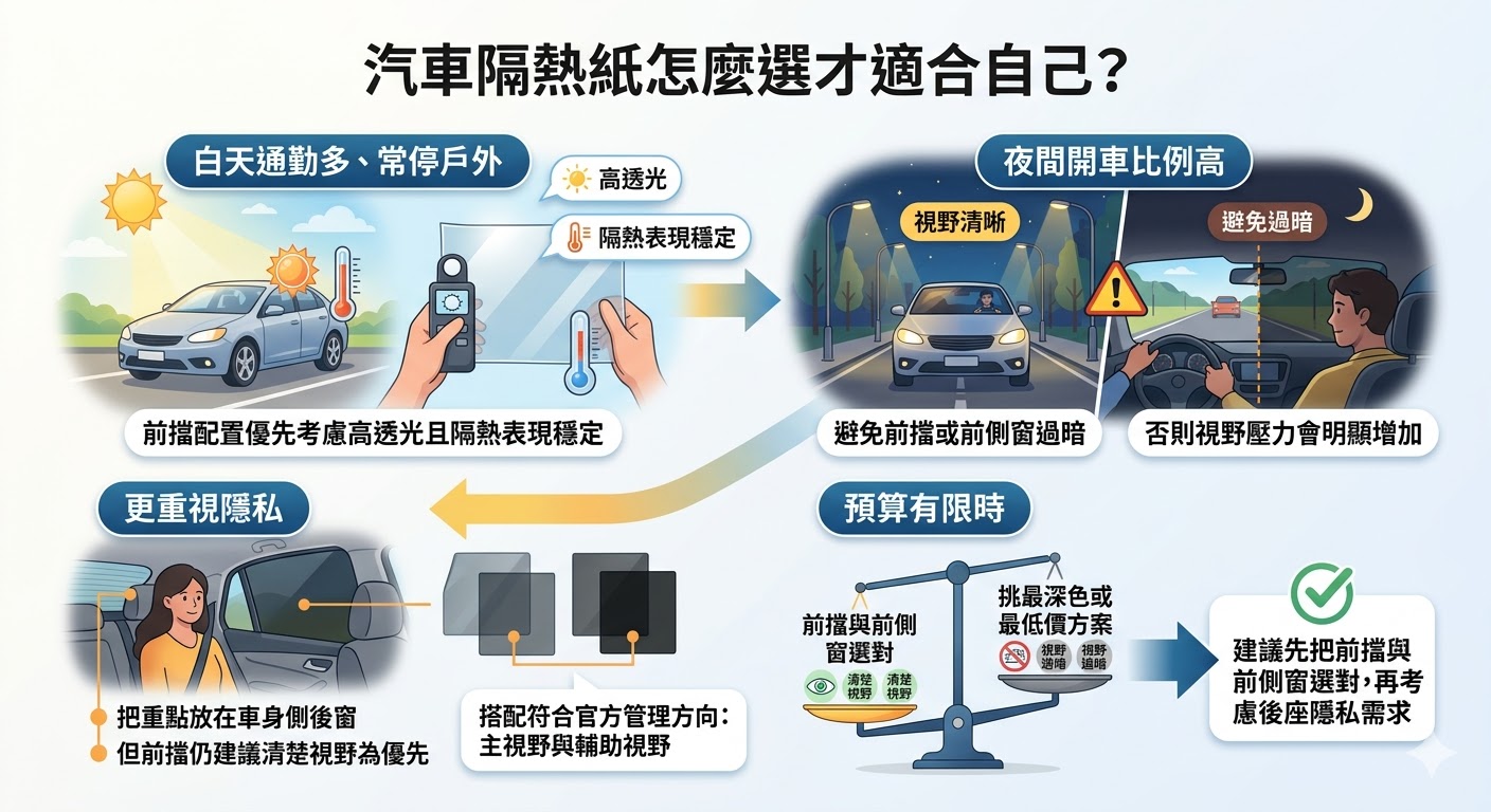 若你白天通勤多、常停戶外,可優先考慮高透光但隔熱表現穩定的前擋配置;若夜間開車比例高,更要避免前擋或前側窗過暗,否則視野壓力會明顯增加。若你更重視隱私,可把重點放在車身側後窗,但前擋仍建議以清楚視野為優先。這樣的搭配方式,也比較符合官方對主視野與輔助視野的管理方向。